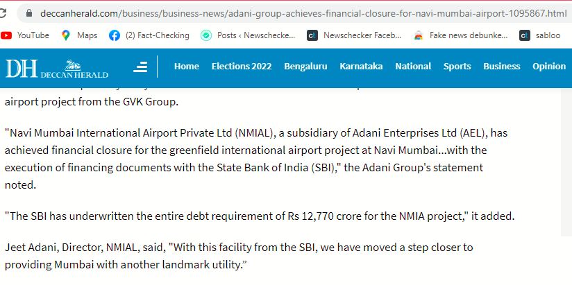 തുടർന്ന് വാർത്തയുടെ കൂടുതൽ വിശദാംശങ്ങൾ തിരഞ്ഞു. അപ്പോൾ ഡെക്കാൻ ഹെറാൾഡിന്റെ റിപ്പോർട്ട് കിട്ടി. “Adani Group achieves financial closure for Navi Mumbai airport” എന്നാണ് റിപ്പോർട്ട് പറയുന്നത്.SBI പ്രോജക്ടിന്റെ എല്ലാ കടവും under write ചെയ്തത് കൊണ്ടാണ് financial closure പൂർത്തിക്കരിക്കാൻ കഴിഞ്ഞത് എന്നും റിപ്പോർട്ട് പറയുന്നു.