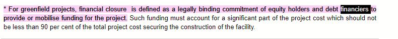 തുടർന്ന് ഞങ്ങൾ ഫിനാൻഷ്യൽ ക്ലോഷർ എന്താണ് എന്ന് പരിശോധിച്ചു .പ്രോജക്റ്റിനായി ഫണ്ടിംഗ് നൽകാനോ സമാഹരിക്കാനോ, ഇക്വിറ്റി ഹോൾഡർമാരും ഡെറ്റ് ഫിനാൻഷ്യർമാരും ഏറ്റെടുക്കുന്ന ഉള്ള നിയമപരമായ പ്രതിബദ്ധതയാണ് ഫിനാൻഷ്യൽ ക്ലോഷർ എന്നാണ് ആർ ബി ഐ നിർവച്ചിച്ചിരിക്കുന്നത്. അത്തരം ഫണ്ടിംഗ് പ്രോജക്റ്റ് ചെലവിന്റെ ഗണ്യമായ ഭാഗം കണക്കിലെടുത്ത് വേണം കണക്കാക്കാൻ, അത് ഈ പ്രൊജക്റ്റ് നിർമ്മാണത്തിനുള്ള പദ്ധതിച്ചെലവിന്റെ 90 ശതമാനത്തിൽ കുറവായിരിക്കരുത്,” എന്ന് ആർ ബി ഐ പറയുന്നു.