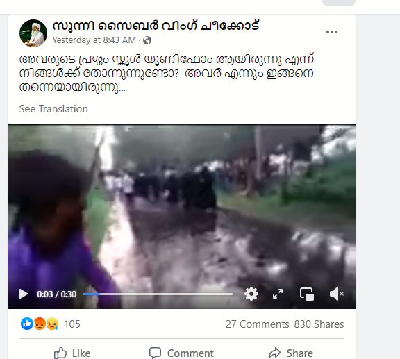 ഞങ്ങൾ പരിശോധിക്കുമ്പോൾ, സുന്നി സൈബർ വിംഗ് ചീക്കോട് എന്ന ഐഡിയിൽ നിന്നും 830 പേർ ഇത് ഷെയർ ചെയ്തിട്ടുണ്ട്.