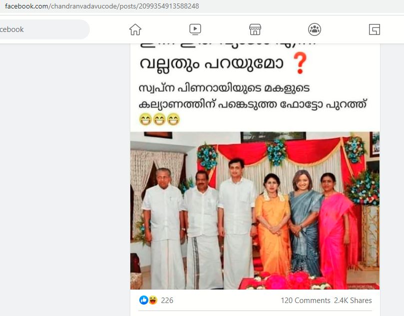 പിണറായി വിജയൻറെ മകളുടെ കല്യാണത്തിന് സ്വർണ കടത്ത് കേസിലെ പ്രതി സ്വപ്ന സുരേഷ് നിൽക്കുന്ന പടം വ്യാപകമായി ഷെയർ ചെയ്യപ്പെടുന്നുണ്ട്. Chandran Vadavucode എന്ന ഐഡിയിൽ നിന്നുള്ള വീഡിയോയ്ക്ക് 2.5 K ഷെയറുകൾ ഞങ്ങൾ നോക്കുമ്പോൾ കണ്ടു.