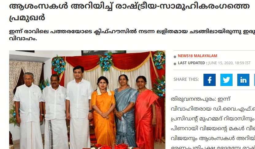 ന്യൂസ് 18 മലയാളവും ജൂൺ 15 2020 ന് ഈ ഫോട്ടോ അവരുടെ റിപ്പോർട്ടിൽ ചേർത്തിരുന്നതായും ഞങ്ങൾ കണ്ടു.ഡി.വൈ.എഫ്.ഐ ദേശീയ പ്രസിഡന്റ് മുഹമ്മദ് റിയാസിനും മുഖ്യമന്ത്രി പിണറായി വിജയന്റെ മകൾ വീണ വിജയനും വിവാഹ ആശംസകൾ അറിയിച്ച് പ്രമുഖർ എന്ന വർത്തയോടൊപ്പമാണ് അത്. നിലവിൽ പൊതുമരാമത്ത് മന്ത്രിയാണ് റിയാസ്.