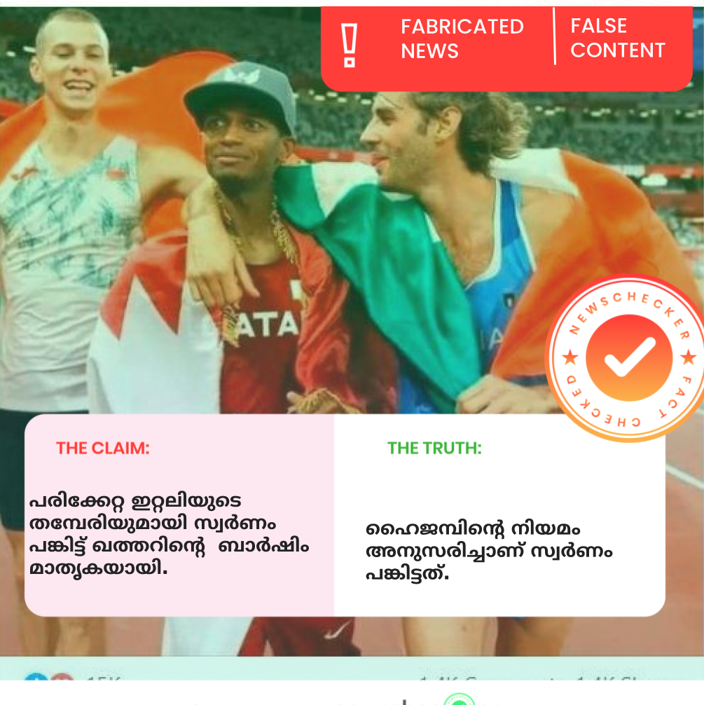 ഇറ്റലിയുടെ താരത്തിന് പരിക്ക് ഉണ്ടായിരുന്നില്ല. പരിക്ക് കൊണ്ട് ഇറ്റലിയുടെ താരം പിന്മാറിയപ്പോൾ ഖത്തർ താരം മാനവികത കാട്ടിയത് കൊണ്ടല്ല സ്വർണം പങ്കു വെച്ചത്. രണ്ടു പേർക്കും gold പങ്ക് വെച്ചത്, ഹൈജമ്പിന്റെ നിയമം അനുസരിച്ചാണ്.