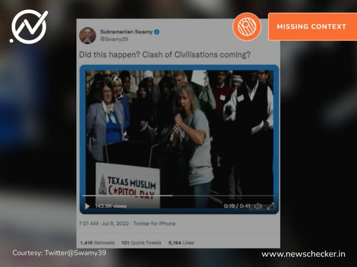 ടെക്സാസ് മുസ്ലിംസ് ക്യാപിറ്റൽ ദിനം തടസ്സപ്പെടുത്തുന്ന സ്ത്രീയുടെ വൈറൽ വീഡിയോ 2015-ൽ നിന്നുള്ള പഴയ വീഡിയോയാണെന്ന് ന്യൂസ്ചെക്കറിന്റെ അന്വേഷണത്തിൽ തെളിഞ്ഞു.