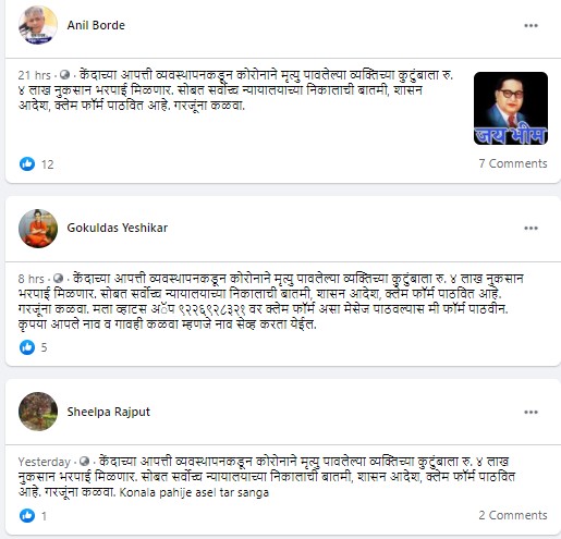 “केंदाच्या आपत्ती व्यवस्थापनकडून कोरोनाने मृत्यु पावलेल्या व्यक्तिच्या कुटुंबाला रु. 4 लाख नुकसान भरपाई मिळणार. सोबत सर्वोच्च न्यायालयाच्या निकालाची बातमी, शासन आदेश, क्लेम फाॅर्म पाठवित आहे. गरजूंना कळवा.”