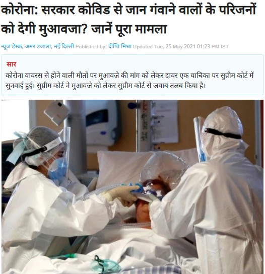 आपत्ती व्यवस्थापन अधिनियम, 2005 नुसार सरकारने कोरोना विषाणूला राष्ट्रीय आपत्ती म्हणून घोषित केले आहे. म्हणून आपत्ती व्यवस्थापन अधिनियम 2005 च्या कलम 12 (3) अन्वये, ज्या कुटुंबातील सदस्याचा आपत्तीमुळे मृत्यू झाला आहे, त्या प्रत्येक सदस्याला चार लाख मिळू शकतात असे या बातमीत म्हटलेले आहे. मात्र आयएमसीआरच्या गाईइडलाईनमुळे ही मदत मिळण्यास अडचण निर्माण होऊ शकते असेही बातमीत म्हटले आहे. या याचिकांवर 11 जूनला सुनवाणी होणार असल्याचे म्हटले आहे. अमर उजालातील बातमीत सुप्रीम कोर्टाने चार लाख रुपये भरपाई देण्याचे निर्देश दिल्याचा उल्लेख कुठेही नाही.