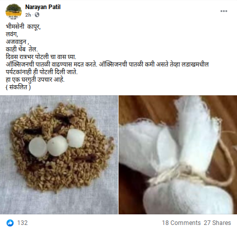 कापूर,लवंगेच्या पोटलीमुळे आॅक्सिजन पातळी वाढते असा दावा करणारी एक पोस्ट सध्या सोशल मीडियात व्हायरल होत आहे. सध्या कोरोनाची दुसरी लाट सुुरु असून यात आॅक्सिजन पातळी अभावी अनेक रुग्णांना प्राण गमवावे लागले आहेत. अशातच आॅक्सिजन पातळी वाढविण्यासाठी या आयुर्वेदिक पोटलीचा उपयोग करावा असा सल्ला या पोस्टमधून देण्यात आला आहे.