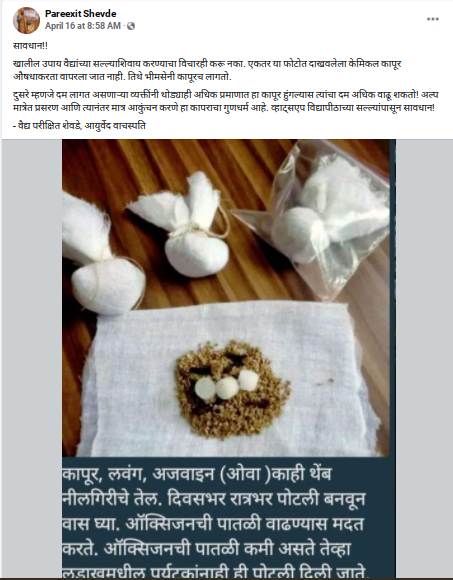पोस्टमध्ये दाखवण्यात आलेला कापूर हा केमिकल युक्त कापूर आहे. त्याचा औषधीय गुणधर्म नाही. त्यामुळे पोस्टमध्ये चुकीचा दावा केला गेला असल्याचे स्पष्ट होते. शिवाय कपूर, लवंग, ओवा आणि निलगिरी तेल रक्तातील ऑक्सिजनची पातळी वाढवते आणि श्वसनाशी संबंधित समस्यांपासून आराम मिळतो. तथापि, सौम्य श्वसन संसर्गामध्ये या थेरपीमुळे तुम्हाला बरे वाटते असा अहवाल देखील कुठेही प्रसिद्ध झालेला नाही. यावरुन हे स्पष्ट होते की, व्हायरल पोस्टमध्ये चुकीचा दावा केला गेला आहे.