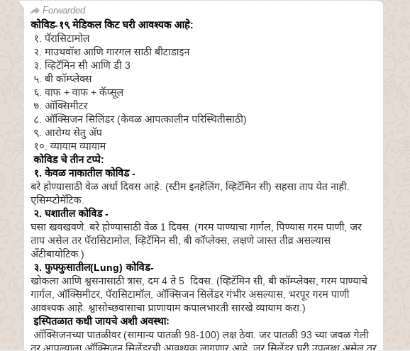 टाटा हेल्थ कंपनीने घरगुती कोविड-19 मेडिकल किट सुचविले असल्याचा एक मॅसेज सध्या सोशल मीडियावर व्हायरल होत आहे. कोरोनाचे टप्पे, कोणती औषधे घरात बाळगावीत तसेच कोरोना होऊ नये म्हणून नेमके काय करावे आहार काय घ्यावा इत्यादी माहिती यात देण्यात आली आहे.