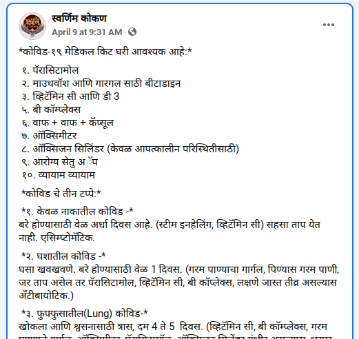 | Claim Review: टाटा हेल्थ कंपनीने कोविड-19 मेडिकल किट सुचविले आहे. Claimed By: Social Media post Fact Check: False |