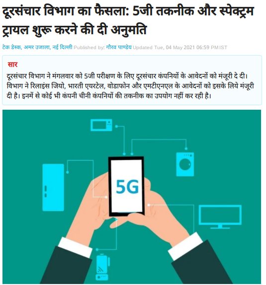 आम्ही याबाबत शोध घेतला असता 4 मे रोजी अमल उजाला या हिंदी दैनिकाच्या वेबसाईटवर 5 जी ट्रायल संदर्भात प्रसिद्ध झालेली बातमी आढळून आली. यात म्हटले आहे की, दूरसंचार विभागाने 5G तंत्रज्ञान आणि स्पेक्ट्रम चाचण्यांना परवानगी दिली आहे. दूरसंचार सेवा कंपन्या भारताता वेगवेगळ्या ठिकाणी 5G चाचणी सुरू करणार असल्याचे मंत्रालयाने मं सांगितले. या कंपन्या ग्रामीण, अर्ध-शहरी आणि शहरी भागात या चाचण्या सुरू करतील.