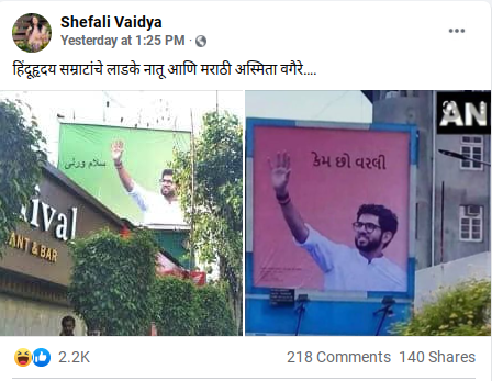 या फोटोवरुन सोशल मीडियात शिवसेना आणि उद्धव आणि आदित्य ठाकरे यांच्यावर टीका केली जात आहे. हिंदूहृदय सम्राट बाळासाहेब ठाकरे यांचे नातू आणि मराठी अस्मिता वगैरे वगैरे…. असे व्हायरल पोस्टमध्ये म्हटले आहे. मुक्त लेखिका आणि प्रसिद्ध स्तंभकार शेफाली वैद्य यांनी देखील हा फोटो सोशल मीडियावर शेअर केला आहे.
