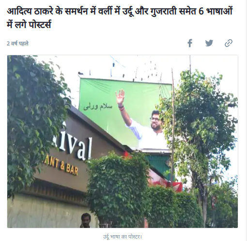 आदित्य ठाकरेंचे उर्दूमधील होर्डिंग व्हायरल झाले आहे. हिरव्या रंगाच्या या होर्डिंगमध्य पांढरा कुर्ता घातलेले आदित्य ठाकरे हात उंचावला आहे, तर उर्दूमध्ये नमसते वरळी असा मजकूर लिहिला आहे.