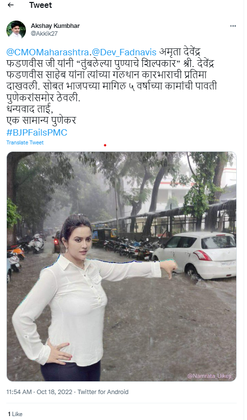 अमृता फडणवीस यांनी मागील वर्षीच्या पावसात मुंबईत साचलेले पाणी आणि रस्त्यांची खराब परिस्थिती यावर भाष्य केले होते.तेच चित्र वापरून पुण्याच्या पावसाच्या चित्राशी एडिट करून हि पोस्ट व्हायरल होत असल्याचे निदर्शनास आले आहे.