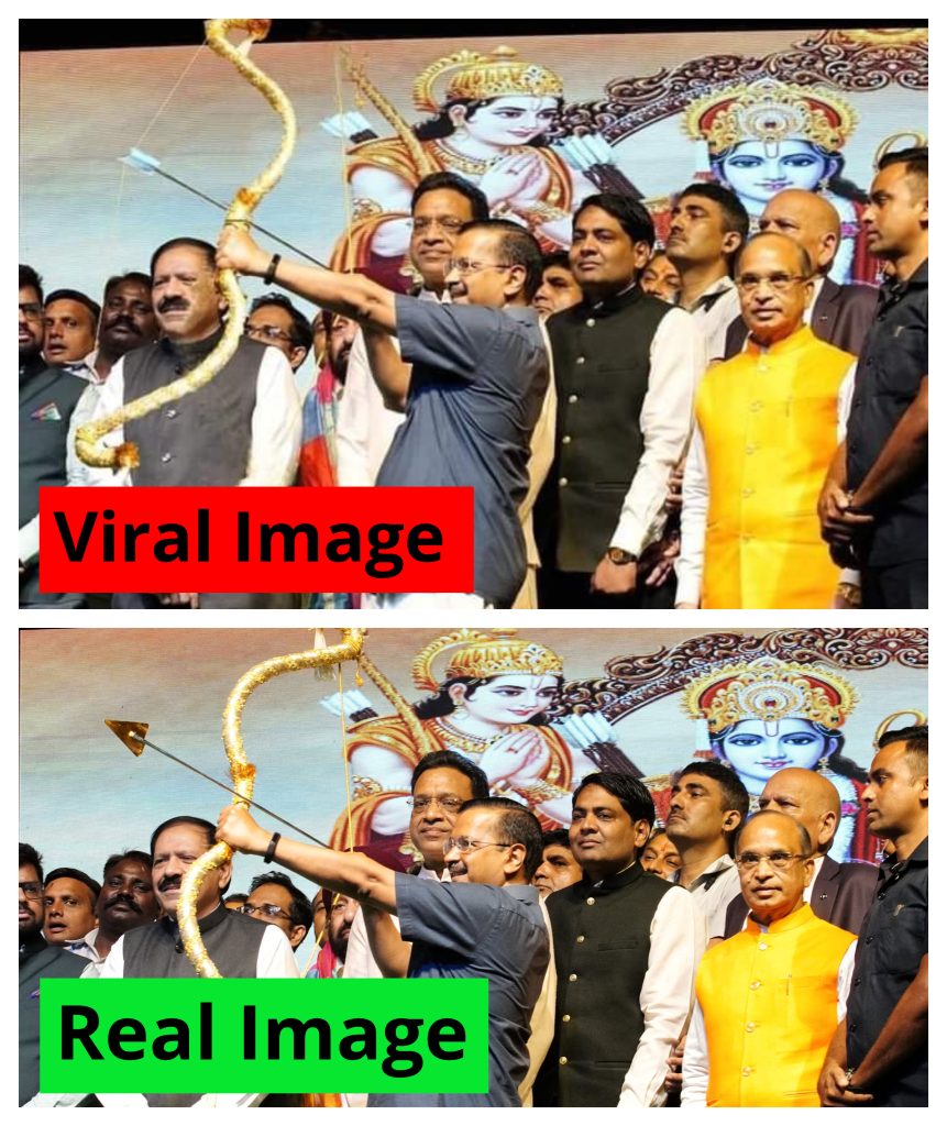 अरविंद केजरीवाल यांचा व्हायरल झालेला हा फोटो खोटा आहे.फोटोचा रिव्हर्स इमेज सर्च केल्यावर सत्य समोर येते.द इंडियन एक्स्प्रेसच्या एका बातमीत,एक वास्तविक चित्र आहे,ज्यामध्ये केजरीवाल धनुष्य-बाण हातात धरलेले दिसत आहेत.मूळ फोटो ५ ऑक्टोबर रोजी दसऱ्याच्या मुहूर्तावर केजरीवाल यांनी दिल्लीच्या लाल किल्ला मैदानावर स्टेजवरून बाण सोडला होता तेंव्हाचा आहे.