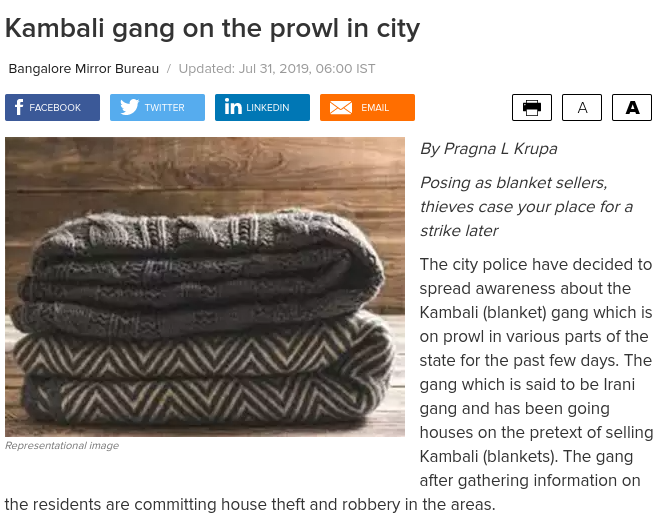 आम्हाला bangaloremirror ची दखील 31 जुलै 2019 रोजीची बातमी आढळून आली, यात देखील कंबल गॅंगपासून सावध राहण्याच्या सूचना पोलिसांनी नागरिकांना केल्याचे म्हटले आहे.