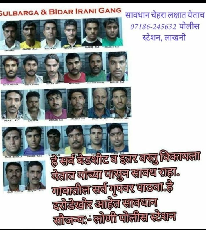 इराणी गॅंगपासून (Iranian gangs) सावध राहण्याचा संदेश लाखनी पोलिसांनी असल्याच्या दाव्याने एक फोटो व्हायरल होत आहे. यात अनेक आरोपींचे फोटो छापले असून ही गॅंग चादर विकण्याच्या बहाण्याने लुटमार करते त्यामुळे यांच्यापासून सावध रहा असे या संदेशात म्हटले आहे.