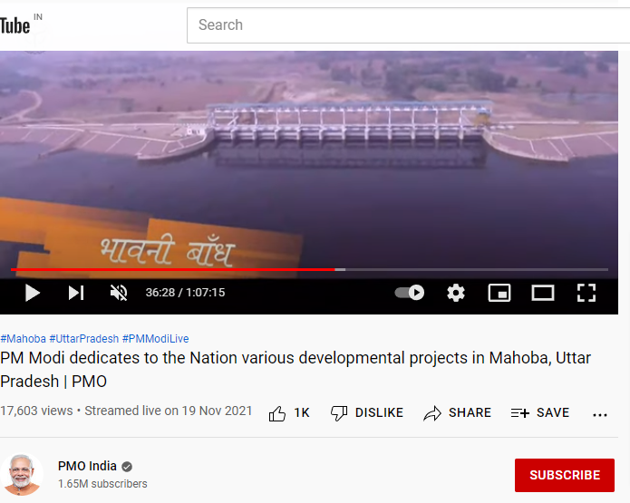 यादरम्यान, 19 नोव्हेंबर रोजी बुंदेलखंडच्या जाहीर सभेतील पंतप्रधान मोदींच्या भाषणाचा 1 तास 7 मिनिटांचा व्हिडिओ आम्हाला मिळाला. व्हिडिओमध्ये पंतप्रधानांनी 36 मिनिटे 28 सेकंदादरम्यान भावनी धरणाचा उल्लेख केला आहे आणि धरणाचे दृश्य देखील दाखवले आहे, व्हायरल दाव्यासह शेअर केलेला फोटो भावनी धरणाची नाही हे स्पष्ट करते.