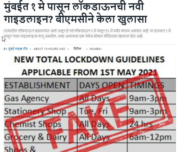 | Claim Review: बीएमसीची मुंबईत 1 मे पासून लाॅकडाऊनची नवी नियमावली Claimed By: Social Media post Fact Check: Misleading |