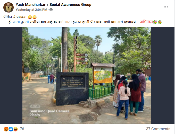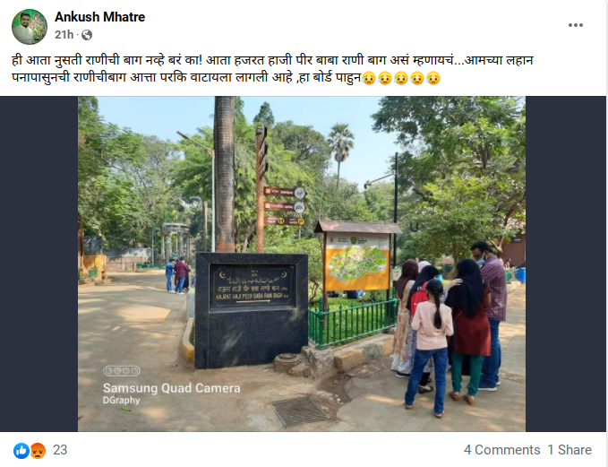 मुंबईतील राणीच्या बागेचे नाव बदलून ‘हजरत हाजी पीर बाबा राणी बाग’ असे करण्यात आले आहे असल्याचा दावा व्हायरल झाला आहे. राणीची बाग या नावानं वीरमाता जिजाबाई भोसले व उद्यान प्राणीसंग्रहालयाला ओळखले जाते पण आता याचे नाव बदलण्यात आल्याचे पोस्टमध्ये म्हटले आहे. व्हायरल होणाऱ्या पोस्टमधील फोटोत हजरत अली पीर बाबा राणी बाग असं लिहिण्यात आलेली एक पाटी दिसते.