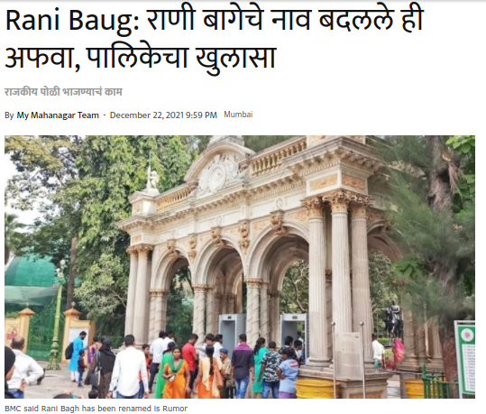 Mymahnagar च्या बातमी आढळली ज्यात म्हटले आहे की, भायखळा येथील पालिकेच्या उद्यानाचे नाव ‘राणी बाग’ नसून ‘वीरमाता जिजाबाई भोसले उद्यान आणि प्राणिसंग्रहालय’ असे आहे. पूर्वीच्या काळापासून लोक या उद्यानाला ‘राणीबाग’ या नावाने संबोधत आले आहेत. या उद्यान परिसरातील जुन्या दर्ग्याचे नाव ‘हजरत हाजी पीर बाबा राणीबाग’ असे पडले आहे, त्यामुळे उद्यानाचे नाव बदललेले नाही, असा खुलासा प्राणी संग्रहालयाचे संचालक डॉ. संजय त्रिपाठी यांनी केला आहे.