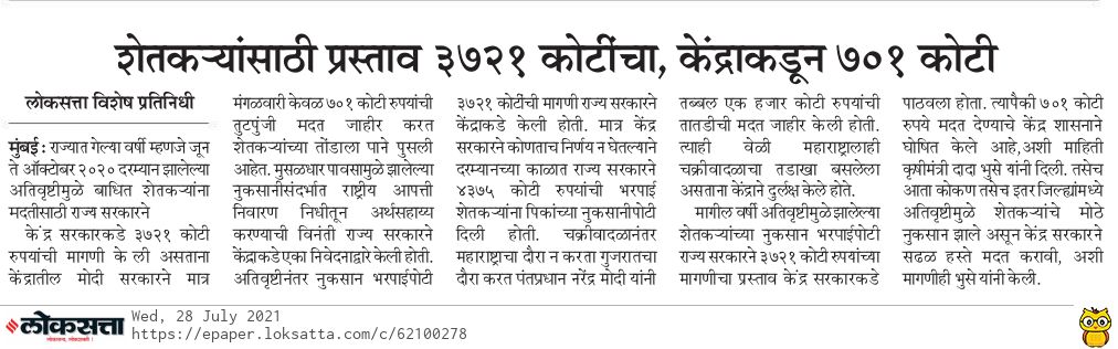 दैनिक लोकसत्ताची बातमी देखील आढळून आली या बातमीत देखील ही मदत जून ते आॅक्टोबर 2020 दरम्यान पूरबाधित शेतक-यांना देण्यात येणार असल्याचे म्हटले आहे शिवाय बातमीत राज्याचे कृषीमंत्री दादा भुसे यांनी आता कोकण व इतर जिल्ह्यांत अतिवृष्टीने शेतकर-यांचे अतोनात नुकसान झाले आहे केंद्र सरकारने सढळ हस्ते मदत करावी अशी मागणी केल्याचा उल्लेख देखील बातमीत करण्यात आला आहे.