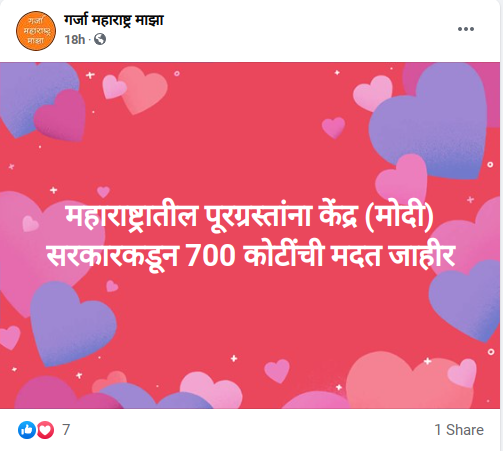याशिवाय फेसबुकवरील काही पोस्टमध्ये केंद्र सरकारने राज्यातील पूरग्रस्त शेतक-यांना 700 कोटींची मदत जाहीर केल्याचे म्हटले आहे.