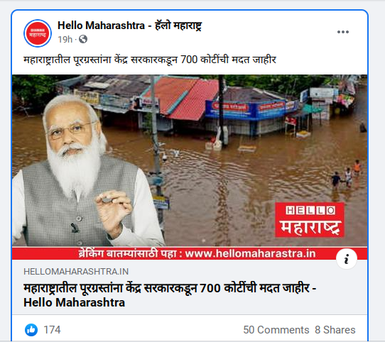 याशिवाय हॅलो महाराष्ट्र नावाच्या न्यूज वेबसाईटवर देखील राज्यात पश्चिम महाराष्ट्र आणि कोकणात मुसळधार पावसामुळे अतोनात नुकसान झाल्याच्या पार्श्वभूमीवर केंद्र सरकारने 700 कोटींची मदत जाहीर केल्याचे म्हटले आहे.