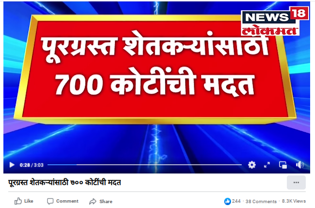 याबबात न्यूज 18 लोकमत ने वृत्त दिले असून यात म्हटले आहे की, केंद्र पूरग्रस्त शेतक-यांना दिलासा दिला असून 700 कोटीची मदत जाहीर केली आहे. केंद्रीय कृषीमंत्री नरेंद्र सिंह तोमर यांनी राज्यातील पूरग्रस्त शेतक-यांच्या मदतीसाठी 700 कोटींचे मदत पॅकेज जाहीर केले आहे.