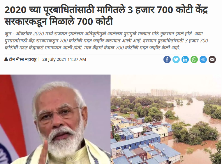 मॅक्स महाराष्ट्र- https://www.maxmaharashtra.com/news-update/center-announces-rs-700-crore-for-flood-victims-in-the-state-964724