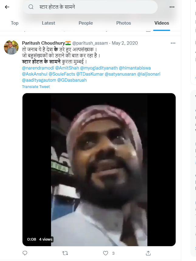 या तपासात आम्हांला कुठलीही माहिती मिळाली नाही. व्हायरल व्हिडिओतील आवाजाच्या साहाय्याने आम्ही ‘स्टार हॉटेलच्या पुढे’ असा कीवर्ड ट्विटरवर टाकून शोधले. यात आम्हांला सोशल मीडियावर २०२० पासून उपलब्ध असलेली एक व्हिडिओ मिळाली.