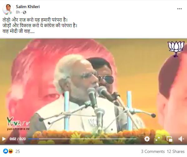 पंतप्रधान नरेंद्र मोदी यांचा एक व्हिडिओ सोशल मीडियावर मोठ्या प्रमाणात व्हायरल होत आहे.व्हिडीओमध्ये मोदी म्हणत आहेत की, ‘तोडा आणि राज्य करा,ही आमची परंपरा आहे,जोडा आणि विकास करा,ही काँग्रेसची परंपरा आहे.हा व्हिडिओ शेअर करून पंतप्रधान नरेंद्र मोदी पहिल्यांदाच खरे बोलले असल्याचा दावा केला जात आहे.व्हिडीओ शेअर करत ट्विटरवर अनेक यूजर्सनी दावा केला की,पंतप्रधान नरेंद्र मोदी पहिल्यांदाच खरे बोलले आहेत.