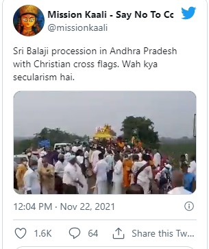 ‘हिंदू मंदिराच्या मिरवणुकांमध्ये आता ख्रिश्चन झेंडे आहेत’ अशा शिर्षकासह शेकडो लोकांनी रागात बालाजीच्या रथावर ख्रिश्चन झेंडा असल्याचा व्हिडिओ रिट्विट केला.
