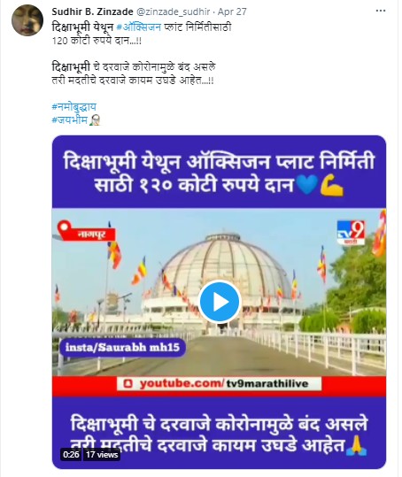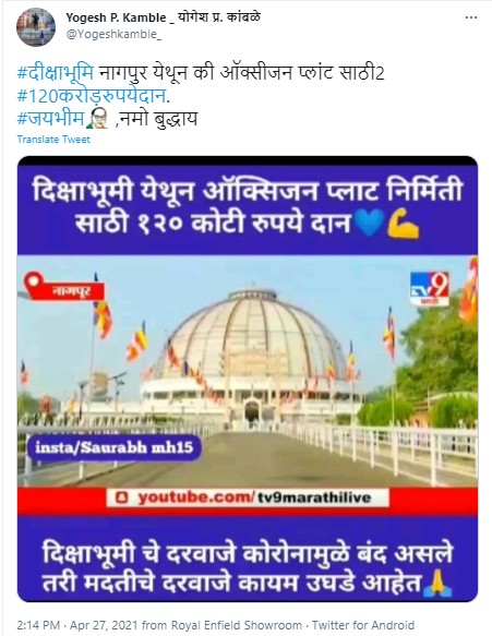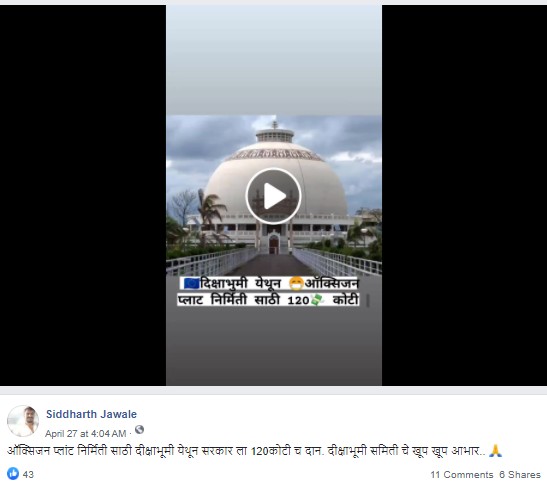 “जय भीम, काही समाजमाध्यमांतून दीक्षाभूमीने ऑक्सिजन प्लांट लावण्यासाठी काही रक्कम दिल्याची खोडसाळ बातमी प्रसारित होत आहे. ही बातमी जर खरी असती तर दीक्षाभूमीला आणि सर्व समाजाला खूप आनंद झाला असता पण दुर्दैवाने ही बातमी खोटी आहे.