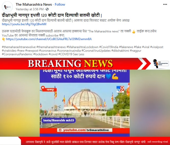 अधिक शोध घेतला असता आम्हाला दीक्षाभूमी नागपूर इथली 120 कोटी दान दिल्याची बातमी खोटी असल्याची माहिती आकाश दादा शिरसाट सम्राट अशोक सेना अध्यक्ष यांनी दिल्याची पोस्ट एका फेसबुक पेजवर आढळून आली.
