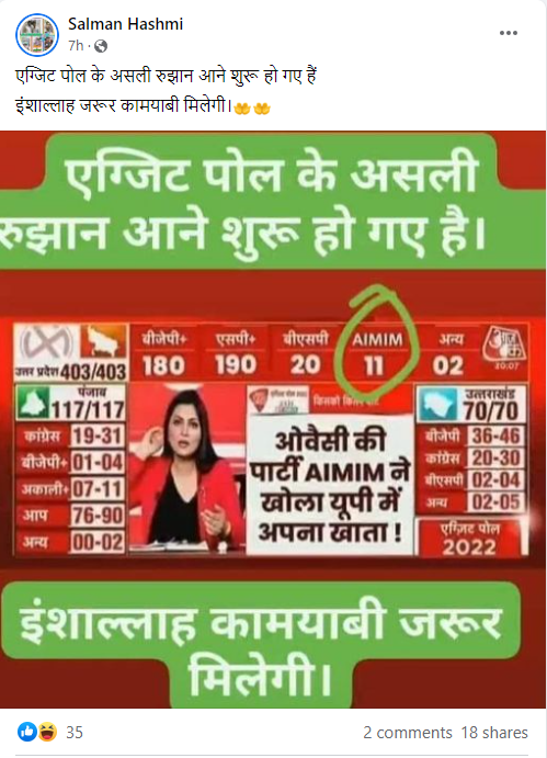 आजतकच्या स्क्रिनशॉटमध्ये दावा केलाय की, वाहिनीने दाखवलेल्या एक्झिट पोलमध्ये असदुद्दीन ओवेसी यांची पार्टी एआयएमआयएम यांना युपीत ११ जागा मिळण्याचा अंदाज आहे. स्क्रिनशॉटमध्ये भाजपला १८०, समाजवादी पार्टीला १९० आणि बसपाला २० जागा मिळण्याचा अंदाज वर्तवला आहे.