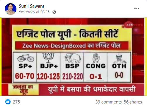 याच्या आधीच्या स्क्रिनशॉटमध्ये पहिले सपा आणि आता बसपा विजयी होण्याचा दावा केला जात आहे. पण दोन्ही स्क्रिनशॉट खोटे आहेत. त्या वेळी केले गेलेले ओपिनियन पोल आणि आता झी न्यूजच्या एक्झिट पोलमध्ये भाजपाच विजयी होण्याचा अंदाज वर्तवला जात आहे.