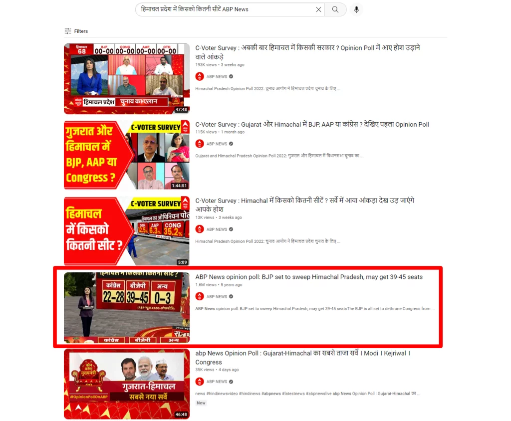 एबीपी न्यूजच्या ओपिनियन पोलमध्ये हिमाचल प्रदेशमध्ये काँग्रेसला बहुमत मिळाल्याच्या नावाखाली शेअर करण्यात येत असलेला हा व्हिडिओ तपासण्यासाठी आम्ही व्हिडिओमध्ये असलेल्या माहितीच्या आधारे ‘एबीपी न्यूज हिमाचल प्रदेश कुणाला किती जागा’ हा कीवर्ड शोधला.या प्रक्रियेत,आम्हाला कळले की व्हायरल व्हिडिओ केवळ जुना नाही तर संपादित देखील आहे.