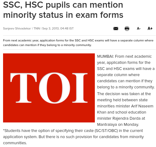 या बातमीत म्हटले आहे की, पुढील शैक्षणिक वर्षापासून एसएससी आणि बारावीच्या परीक्षांच्या अर्जावर स्वतंत्र कॉलम असेल ज्यामध्ये उमेदवार अल्पसंख्याक समुदायाचे असल्यास ते नमूद करू शकतील. राज्याचे अल्पसंख्याक मंत्री आरिफ नसीम खान आणि शालेय शिक्षणमंत्री राजेंद्र दर्डा यांच्यात सोमवारी मंत्रालयात झालेल्या बैठकीत हा निर्णय घेण्यात आला.