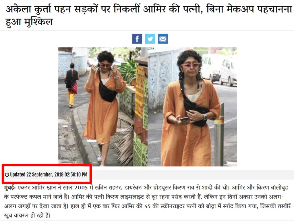 2015 मध्ये रामनाथ गोएंका पुरस्कार सोहळ्यादरम्यान आयोजित केलेल्या चर्चेत इंडियन एक्सप्रेस ग्रुपचे कार्यकारी संचालक अनंत गोयंका यांच्याशी संवाद साधताना अभिनेता आमिर खानने देशात भीती,असुरक्षितता आणि असहिष्णुतेचे वातावरण असल्याचे विधान केले. किरण आणि तो त्यांचे संपूर्ण आयुष्य भारतात जगत आहेत, पण पहिल्यांदाच आपण भारत सोडावा का?असे विचार मनात येत असल्याची प्रतिक्रिया आमिर खान याने दिली होती.आमिरच्या या वक्तव्यानंतर मोठा वाद निर्माण झाला होता.त्याच संदर्भाने,सोशल मीडिया वापरकर्ते विनोदी भावाने एक छायाचित्र शेअर करत असून,असहिष्णुतेबद्दल बोलणाऱ्या आमिर खानची माजी पत्नी किरण राव घटस्फोटानंतर आता वांद्रे येथे एकटीच फिरत असल्याचा दावा केला जात आहे. हा दावा ट्विटर आणि फेसबुकवरही मोठ्या प्रमाणात शेअर केला जात आहे.चित्र तपासण्यासाठी,आम्ही ते Google वर शोधले.या प्रक्रियेत,आम्हाला 27 सप्टेंबर 2019 रोजी बॉलीवूड तडका नावाच्या वेबसाइटने प्रकाशित केलेला एक लेख आढळला,ज्यात निर्माता किरण राव मेकअपशिवाय वांद्रे येथे फिरताना दिसत असल्याची माहिती देणारे व्हायरल चित्र आणि इतर अनेक तत्सम चित्रे शेअर केली होती.