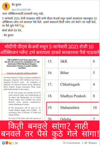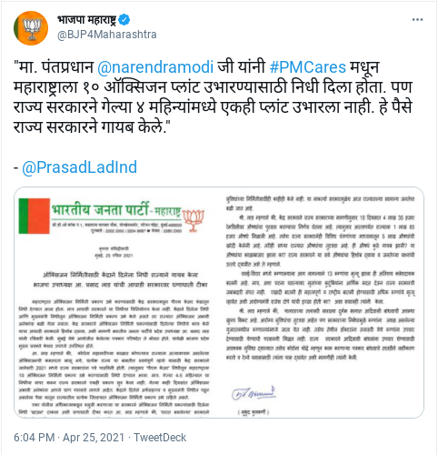 राज्य सरकारने पीएम केअर फंडामधून महाराष्ट्राला १० ऑक्सिजन प्लांट उभारण्यासाठी निधी गायब केला केल्याचा दावा भाजपा आमदारासह अनेक यूजर्सनी केला आहे. यात म्हटले आहे की, राज्य सरकारने गेल्या ४ महिन्यांमध्ये एकही प्लांट उभारला नाही. हे पैसे राज्य सरकारने गायब केले आहेत.