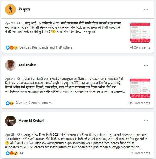 आणखी एका युजरने उद्धव साहेब ठाकरे हे पैसे कुठे गेले, नाहीतर oxygen प्लांट बनवले असतील तर ते दाखवा” – 7 एप्रिल, २०२० ला म्हणजे गेल्या वर्षी केंद्र सरकारने सर्व राज्यांना ऑक्सिजन प्लांट साठी परवानगी दिली आणि ५ जानेवारी, २०२१ मध्ये राज्यांना असा प्लांट उभा करायला एकूण रु.२०१.५८ कोटी दिले. ज्यामध्ये महाराष्ट्राला रु. १० कोटी मिळाले. असा दावा केला आहे.