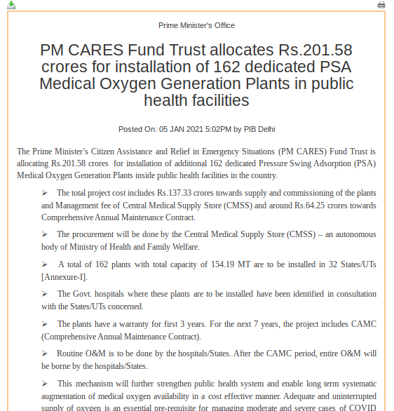 व्हायरल होत असलेला दावा खरा आहे का याचा शोध घेण्याचा आम्ही प्रयत्न केला. या शोधादरम्यान आम्हाला पीआयबीची 5 जानेवारी 2021 रोजीची एक प्रेस रिलीज आढळून आली ज्यात म्हटले आहे की, भारतातील जिल्हा रुग्णालयांमध्ये ऑक्सिजन प्लांट्स उभे करण्यासाठी निधी जाहीर झाला असून पीएम केअर्स फंडातून 162 प्लांट्स साठी 201.85 कोटी रुपये एवढा निधी जाहीर झाला. या 163 पैकी 10 प्लांट्स महाराष्ट्रातील जिल्हा रुग्णालयांना देणार असल्याचे म्हटले आहे.