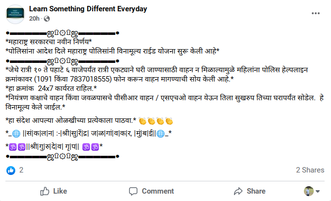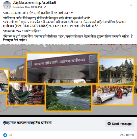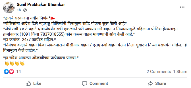 सोशल मीडियात एक मेसेज व्हायरल होत आहे. यात दावा करण्यात आला आहे की, ठाकरे सरकारने रात्री एकट्या महिलांना घरी पोहचण्यासाठी विनामुल्य राईड उपलब्ध करुन दिली आहे. ही सेवा रात्री 10 ते सकाळी 6 वाजेपर्यंत असेल.