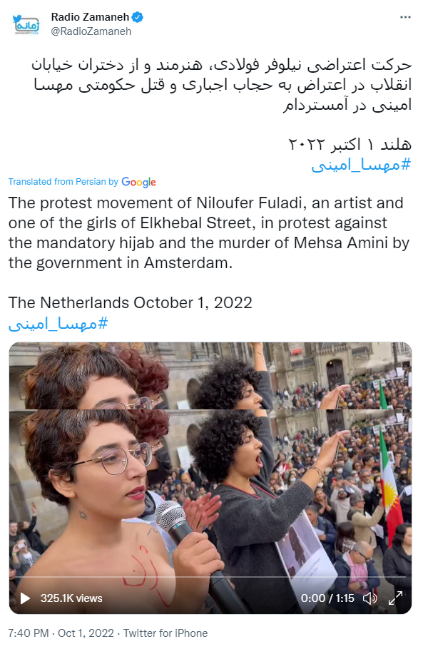 व्हायरल व्हिडिओ 1 ऑक्टोबर 2022 रोजी केलेल्या “रेडिओ जमानेह” च्या या ट्विटमध्ये उपस्थित आहे. तसेच, ट्विटमध्ये पर्शियन भाषेत लिहिले आहे की, व्हिडिओमध्ये दिसणारी टॉपलेस महिला निलोफर स्टीली नावाची कलाकार आहे जी जबरदस्तीने हिजाब घालण्याची प्रथा आणि महसा अमिनीच्या मृत्यूचा निषेध करत आहे. पण ट्विटमध्ये असेही सांगण्यात आले आहे की, नेदरलँड्सची राजधानी अमस्टरडॅममध्ये हा निषेध करण्यात आला.