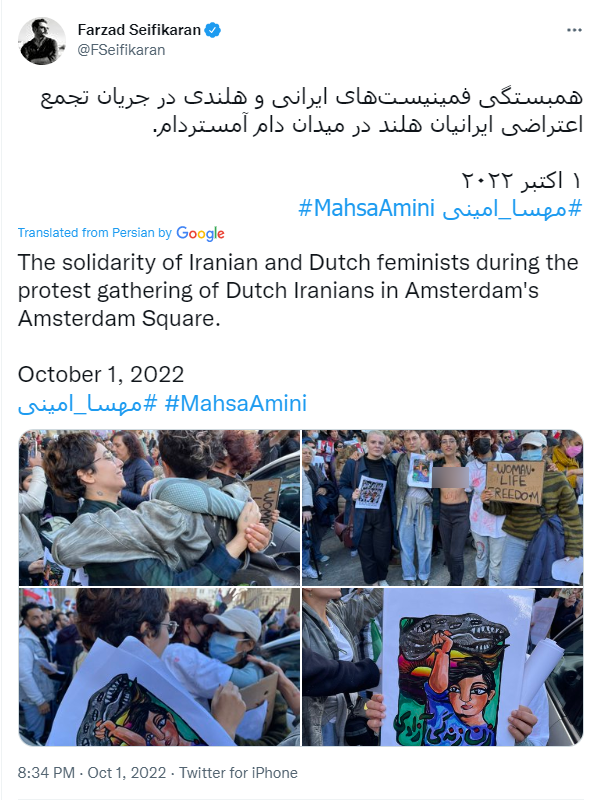 “रेडिओ जमानेह” च्या पत्रकाराने 1 ऑक्टोबर रोजी अमस्टरडॅममध्ये झालेल्या निषेधाची काही छायाचित्रे देखील ट्विट केली. यातील काही छायाचित्रांमध्ये व्हायरल झालेल्या व्हिडीओतील महिलाही दिसत आहे.