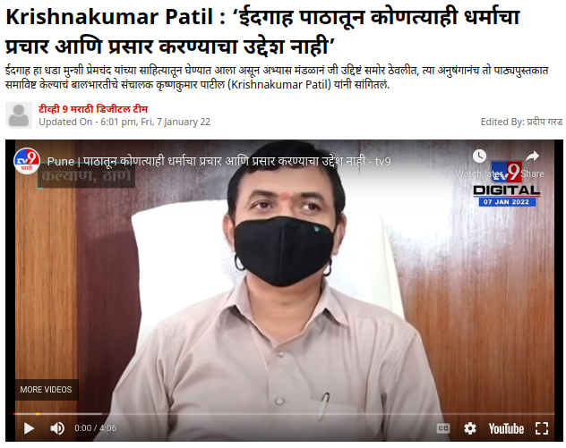 अधिक तपास केला असता, आम्हाला बालभारतीचे संचालक कृष्णकुमार पाटील यांनी याबाबत स्पष्टीकरण दिल्याची बातमी टिव्ही 9 मराठीच्या वेबसाईटवर आढळून आली. यात पाटील यांनी म्हटले आहे की, हा धडा मुन्शी प्रेमचंद यांच्या साहित्यातून घेण्यात आला असून अभ्यास मंडळानं जी उद्दिष्टं समोर ठेवलीत, त्या अनुषंगानंच तो पाठ्यपुस्तकात समाविष्ट केला आहे. मविआ सरकारने मुस्लिमांच्या उदात्तीकरणासाठी हा धडा अभ्यासक्रमात समाविष्ठ केलेला नाही.