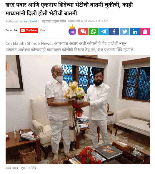 लोकसत्ता, लोकमत, झी २४ तास, न्यूज १८ लोकमत, तरुण भारत, दैनिक प्रभात, थोडक्यात, महाराष्ट्र केसरी, माय महानगर, सोलापूर वार्ता, अहमदनगर लाईव्ह २४, ग्लोबल न्यूज मराठी, हॅलो महाराष्ट्र यांनी शरद पवार आणि एकनाथ शिंदे यांची नुकतीच भेट झाल्याची बातमी दिली आहे.