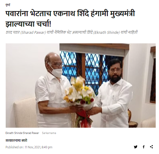 शरद पवार आणि एकनाथ शिंदे यांची भेट झाल्याची बातमी खरी आहे का, याची पडताळणी करण्यासाठी आम्ही गुगलवर ‘एकनाथ शिंदे आणि शरद पवार भेट’ असं टाकून शोधले. पण आम्हांला कोणतीही माहिती मिळाली नाही. त्यानंतर आम्ही त्या बातमीसोबत जोडलेला फोटो गुगल रिव्हर्सच्या मदतीने शोधला. त्यावेळी आम्हांला सरकारनामाची ११ नोव्हेंबर २०२१ ची बातमी मिळाली. त्यात देखील नुकताच अनेक बातम्यांमध्ये वापरण्यात आलेला फोटो वापरला होता.
