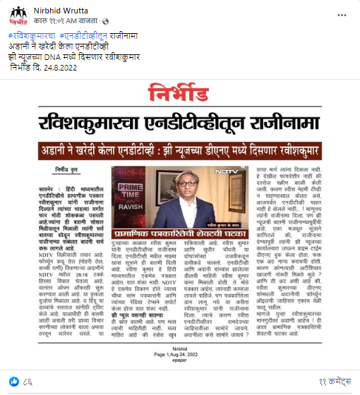निर्भीड या डिजिटल वृत्तपत्राने बातमी दिलीये की, अदानी समूहाने एनडीटीव्हीचा हिस्सा विकत घेतल्यावर पत्रकार रवीश कुमार यांनी राजीनामा दिला.