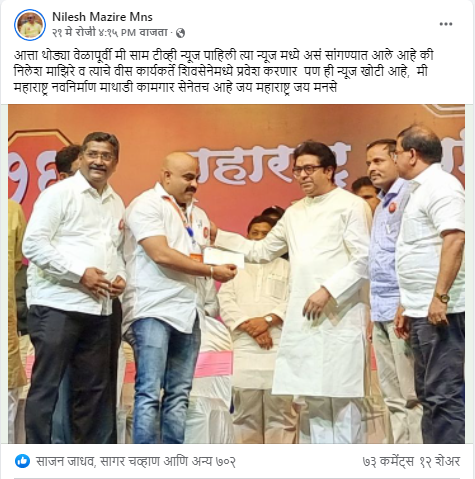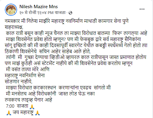 निलेश माझिरे यांनी २१ मे २०२२ रोजी पुन्हा एक फेसबुक पोस्ट टाकली. त्यात लिहिले होते की, मी आणि वीस कार्यकर्ते शिवसेनेत प्रवेश करणार, ही बातमी खोटी आहे.
